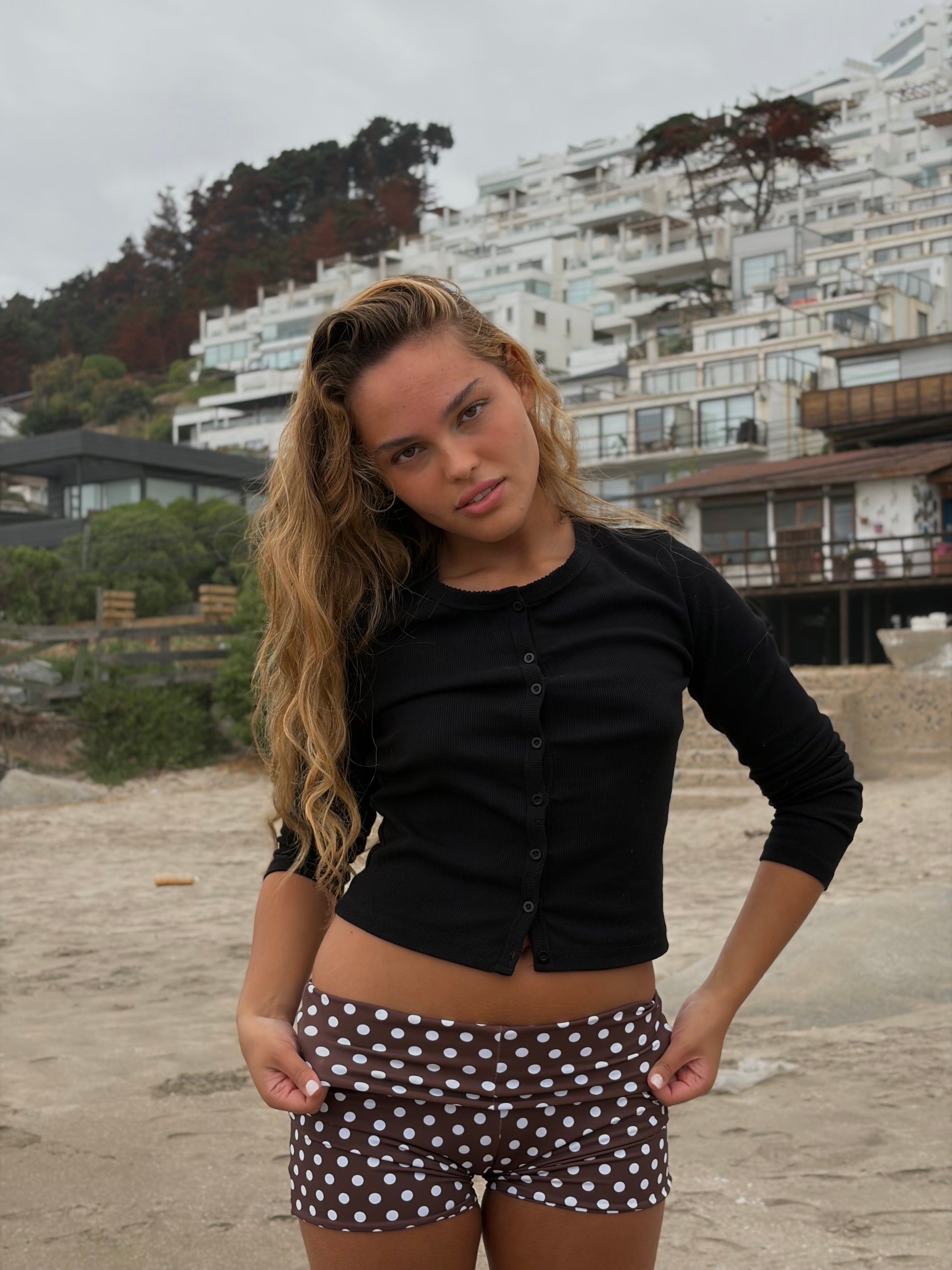 Shorts elasticados, doble tela lycra. Café con lunares blancos